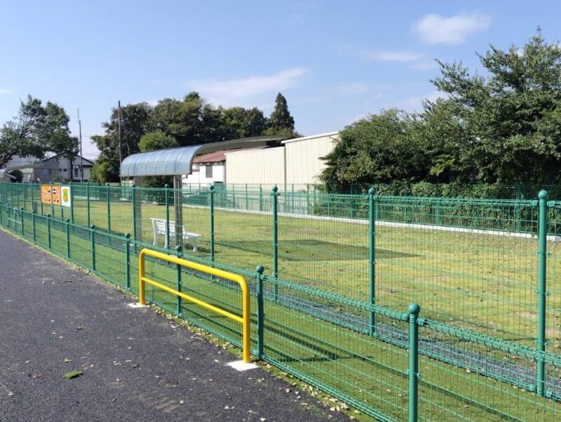 駐車場の一部を改修し、ドッグランを新設しました。 ドッグラン内は大型犬エリアと小型犬エリアに区分し、それぞれを仕切るフェンスおよび門扉を設置しています。 また、通路部分のフェンスが低いため、安全確保と注意喚起を目的としてアーチ型バリカーを設置しました。 さらに、利用者が快適に過ごせるよう、日差しを防ぐ屋根付きの休憩スペースも設けました。